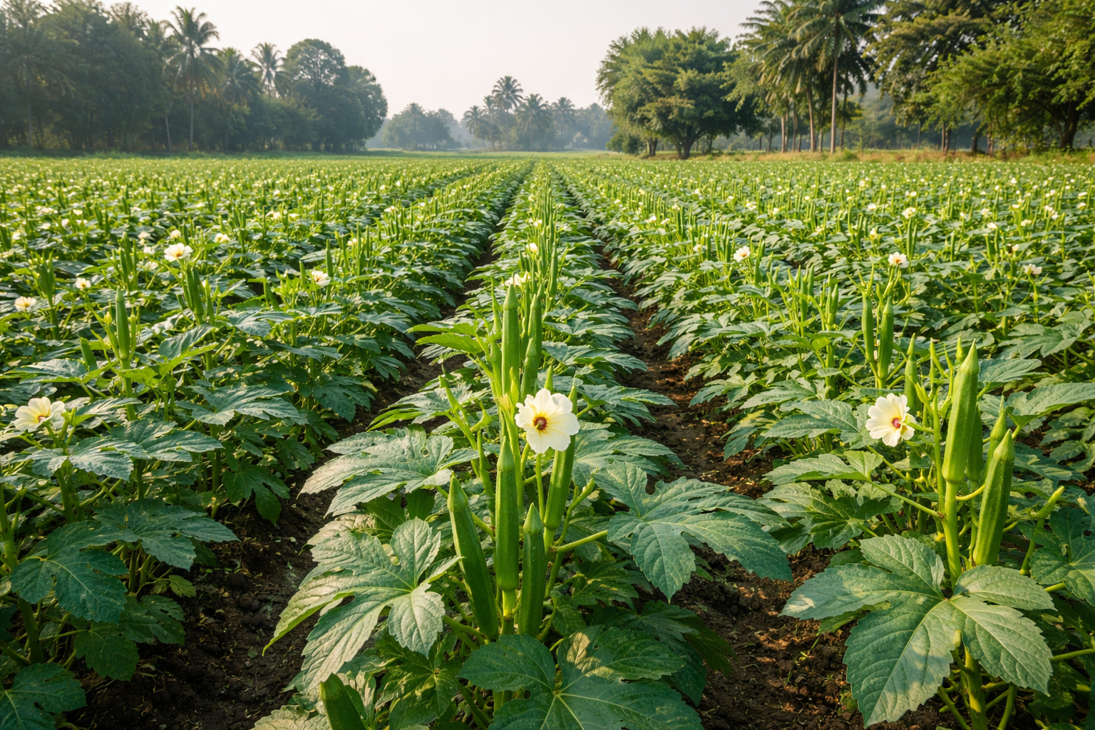 भिंडी (Okra) की बुवाई का समय फरवरी से मार्च तक होता है। गर्मी के मौसम में इसकी फसल को 4–5 दिनों के अंतराल पर नियमित सिंचाई की आवश्यकता होती है। कीट प्रबंधन के लिए फल छेदक कीट से बचाव हेतु फेरोमोन ट्रैप का उपयोग करना चाहिए और नीम तेल का नियमित छिड़काव करना लाभदायक होता है। उचित देखभाल के साथ भिंडी की अनुमानित उपज लगभग 100–120 क्विंटल प्रति हेक्टेयर होती है।