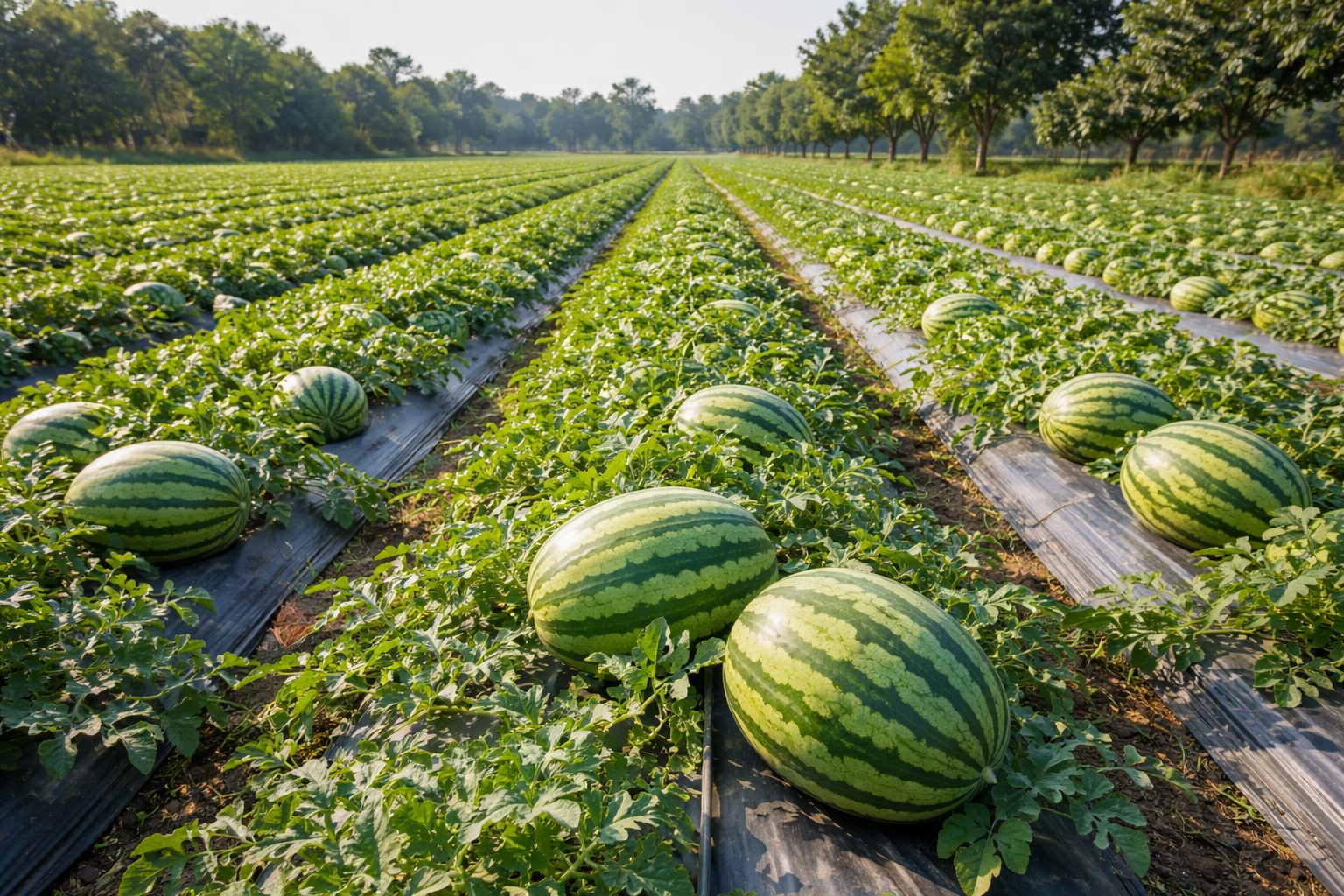 तरबूज (Watermelon) की बुवाई का समय जनवरी से मार्च तक होता है। इसकी खेती में ड्रिप सिंचाई सबसे उत्तम मानी जाती है, और फल पकने के समय पानी कम कर देना चाहिए ताकि मिठास बढ़ सके। कीट प्रबंधन के लिए फ्रूट फ्लाई से बचाव हेतु ट्रैप लगाना चाहिए तथा पाउडरी मिल्ड्यू रोग के नियंत्रण के लिए सल्फर का प्रयोग करना चाहिए। उचित देखभाल के साथ तरबूज की अनुमानित उपज लगभग 400–500 क्विंटल प्रति हेक्टेयर होती है।।